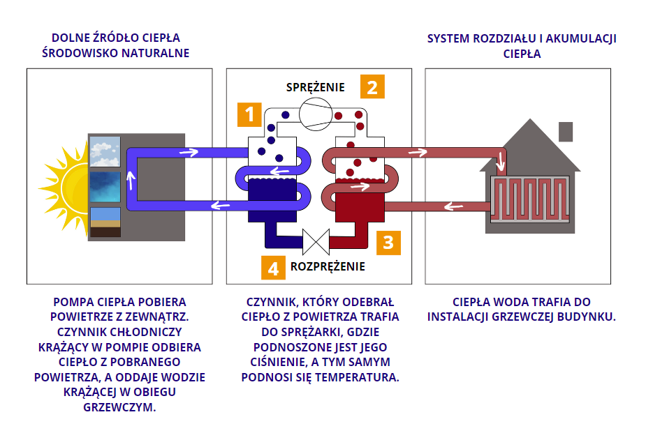 Za odbieranie ciepła, odpowiedzialne są takie elementy, jak parownik, wentylator, a także sprężarka. Natomiast jednostka nawiewna zajmuje się ostatecznie nagrzewaniem bądź chłodzeniem budynku, w którym została zainstalowana powietrzna pompa ciepła. W odróżnieniu od pompy powietrze woda, energia cieplna jest przenoszona przez wymiennik ciepła będący powietrzem, a nie wodą.